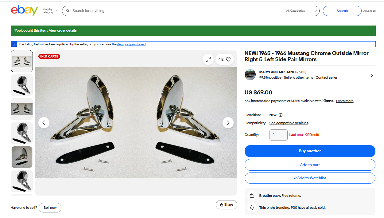 NEW! 1965 - 1966 Mustang Chrome Outside Mirror Right & Left Side Pair Mirrors