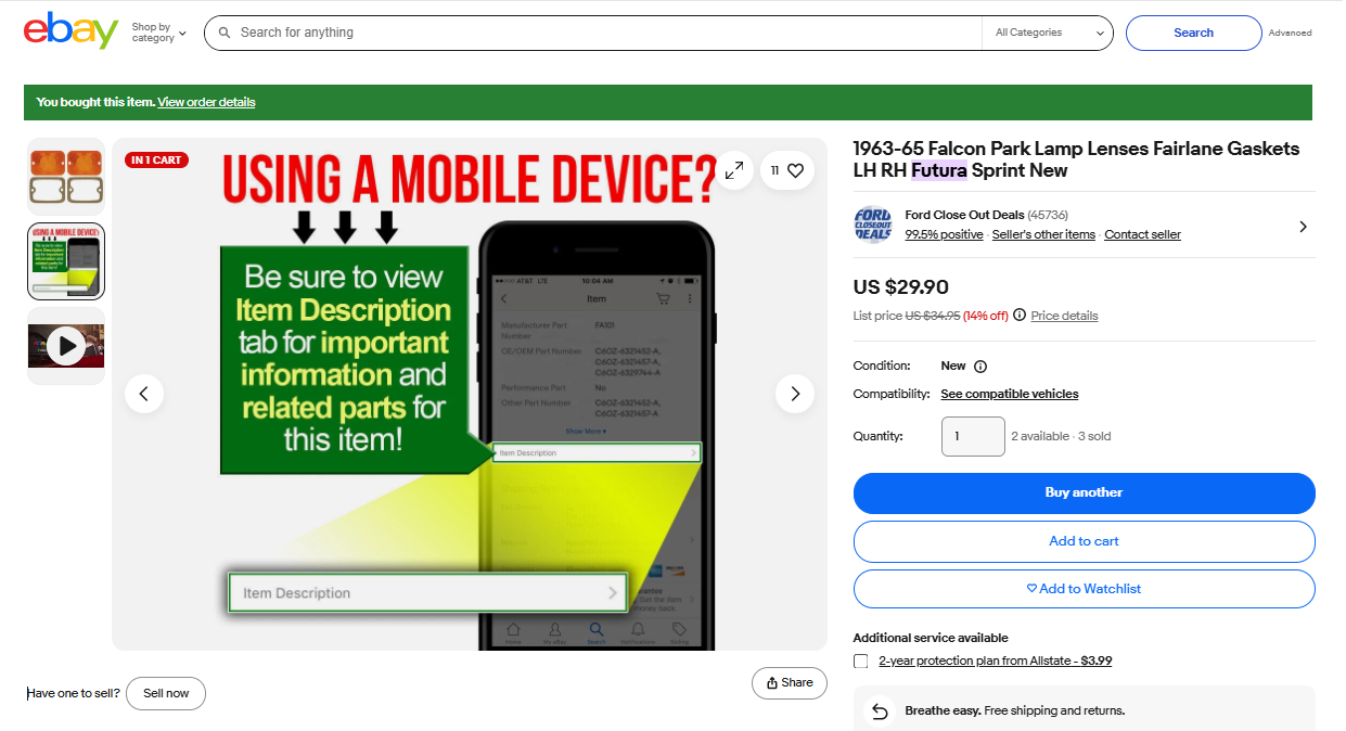 1963-65 Falcon Park Lamp Lenses Fairlane Gaskets LH RH Futura Sprint New