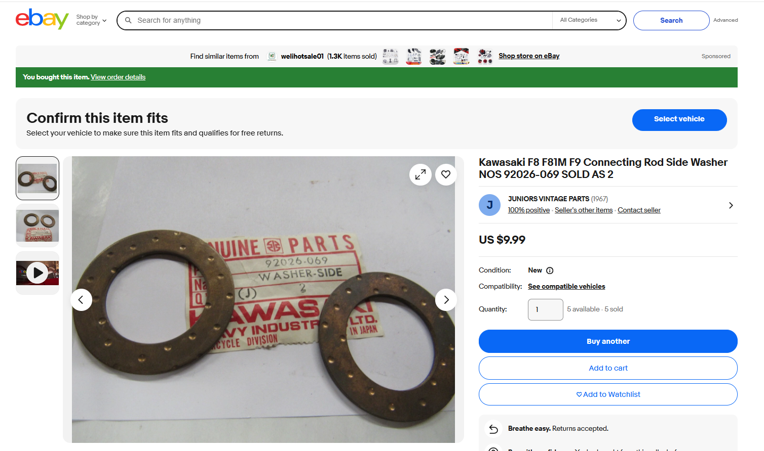 Kawasaki F8 F81M F9 Connecting Rod Side Washer NOS 92026-069 SOLD AS 2