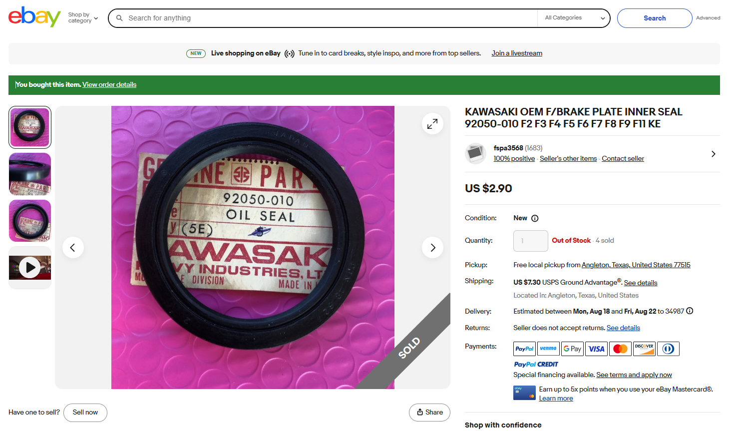 KAWASAKI OEM F/BRAKE PLATE INNER SEAL 92050-010 F2 F3 F4 F5 F6 F7 F8 F9 F11 KE