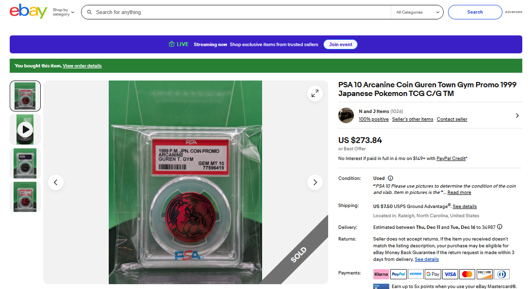 PSA 10 Arcanine Coin Guren Town Gym Promo 1999 Japanese Pokemon TCG C/G TM