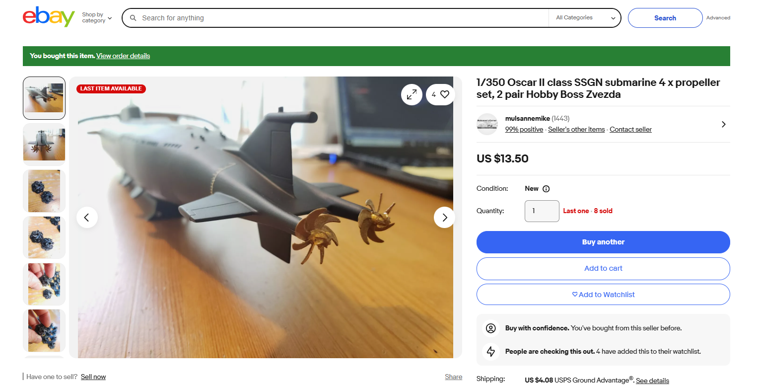 1/350 Oscar II class SSGN submarine 4 x propeller set, 2 pair Hobby Boss Zvezda