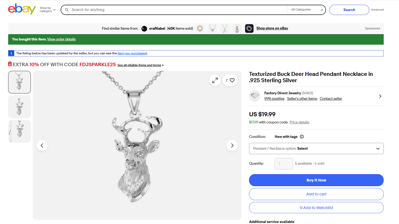 Texturized Buck Deer Head Pendant Necklace in .925 Sterling Silver