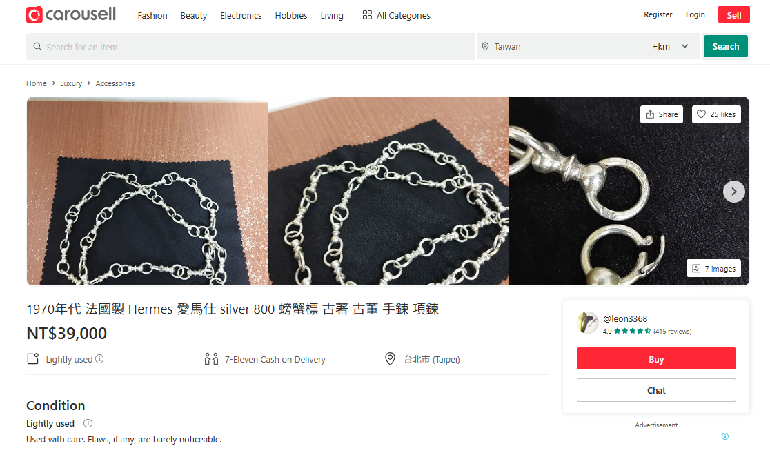 1970年代 法國製 Hermes 愛馬仕 silver 800 螃蟹標 古著 古董 手鍊 項鍊