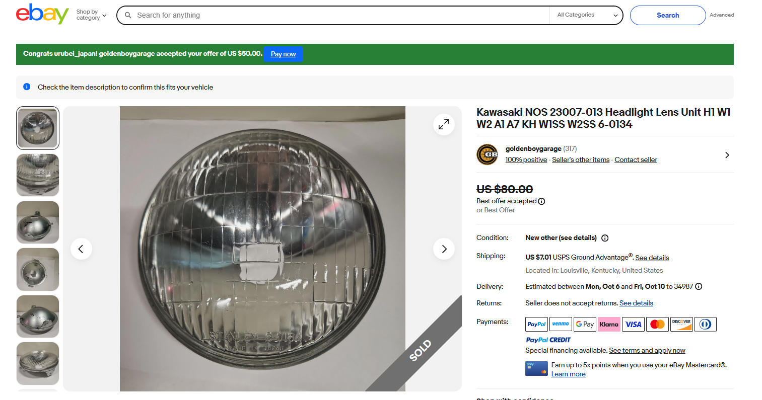 Kawasaki NOS 23007-013 Headlight Lens Unit H1 W1 W2 A1 A7 KH W1SS W2SS 6-0134