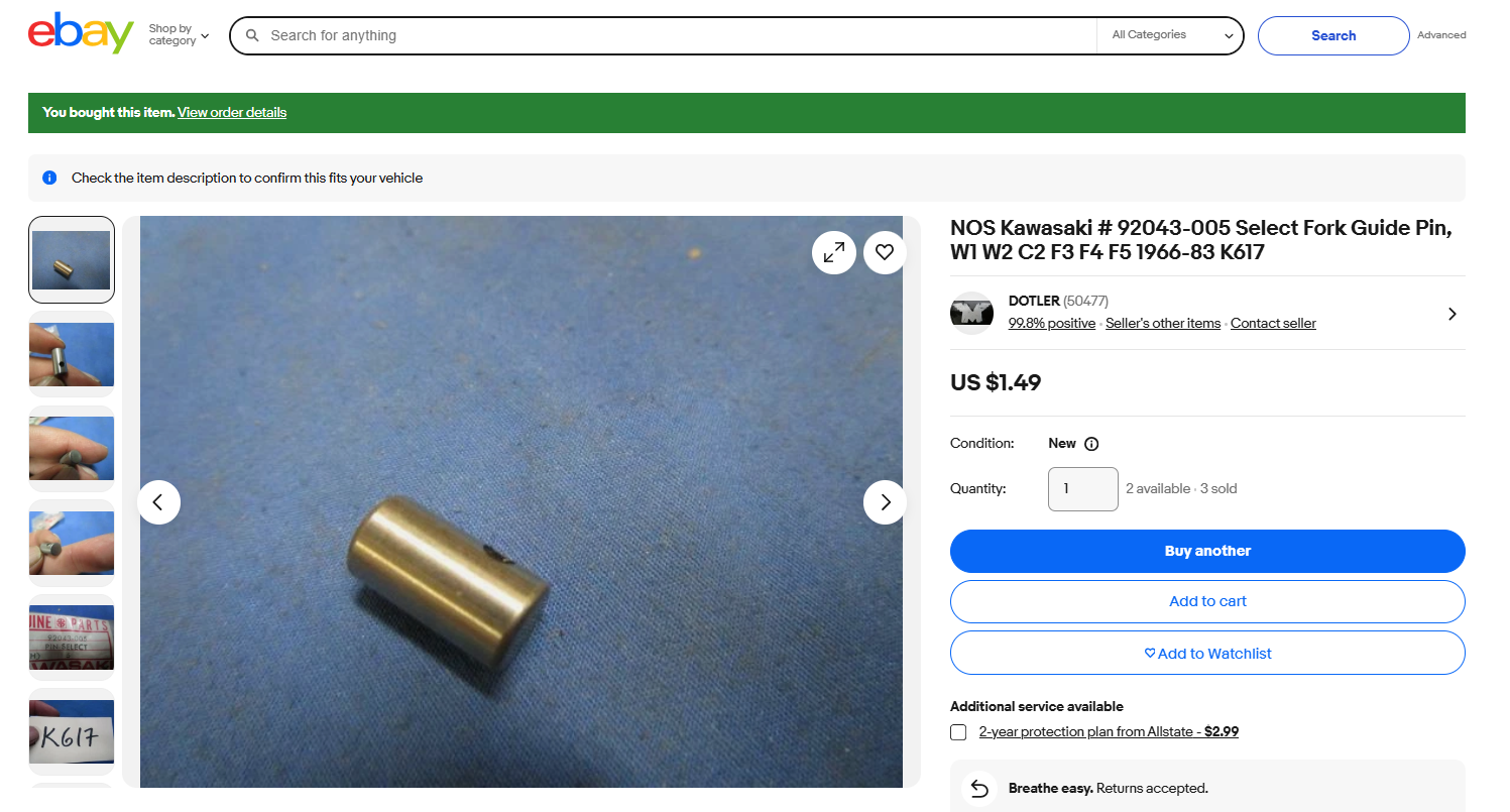 NOS Kawasaki # 92043-005 Select Fork Guide Pin, W1 W2 C2 F3 F4 F5 1966-83 K617