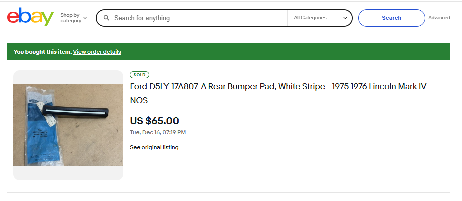 Ford D5LY-17A807-A Rear Bumper Pad, White Stripe - 1975 1976 Lincoln Mark IV NOS