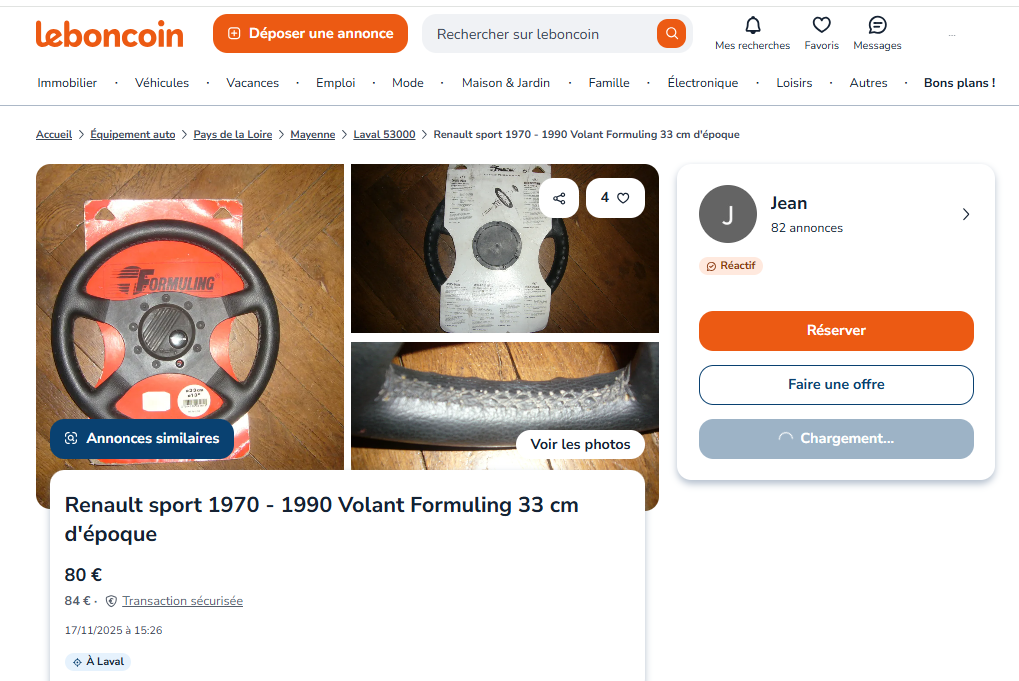 Renault sport 1970 - 1990 Volant Formuling 33 cm d'époque